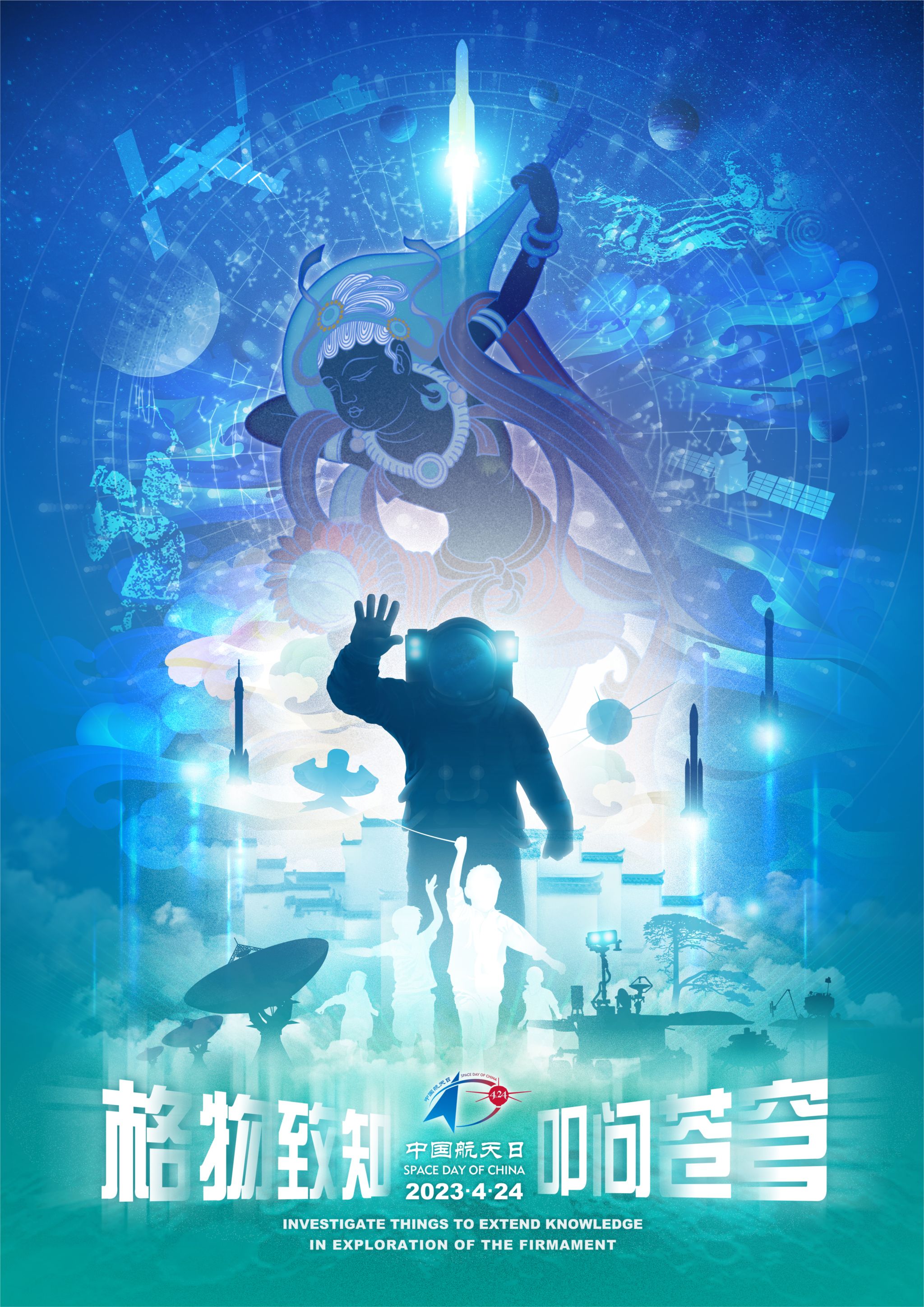 该海报在设计中包含了“格物致知”“叩问苍穹”“绵延庚续”“礼敬安徽”四个层面。画面中既有“反弹琵琶”飞天形象,佐以汉代画像砖中的后羿和龙车、宋代星相图、祥云等图形,代表了古代中国对浩瀚宇宙的向往;又有航天员、东方红卫星、长征系列火箭、天宫空间站、祝融、嫦娥、羲和等中国航天典型元素符号,彰显了中国航天事业的蓬勃进程,描绘出航天强国建设的航天梦。此外,用剪影表现的一群向往科学、奔向未来的青少年形象,表达了赓续中国航天血脉、不断推进航天事业的愿景;画面中穿插的徽派建筑和迎客松,也突显了举办地安徽的地方特色。