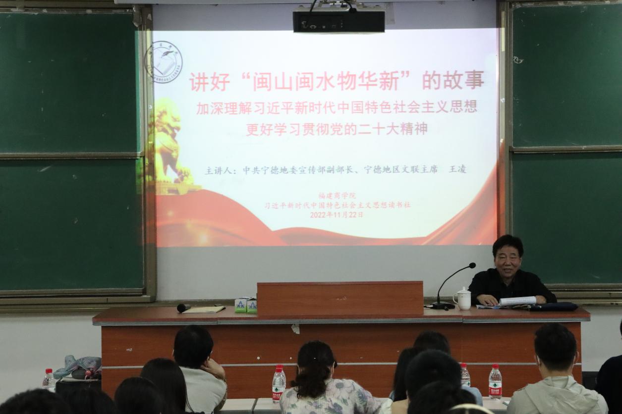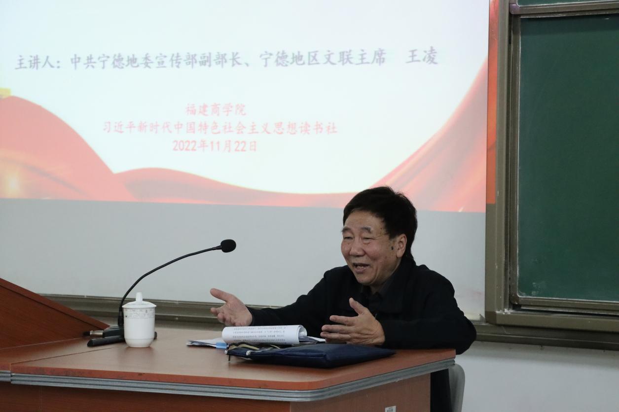 闽山闽水物华新,“习言习语”催人进。11月22日晚,中共宁德地委宣传部原副部长、原宁德地区文联主席王凌研究员受邀莅临永利官网,为永利官网师生作了题为《讲好“闽山闽水物华新”的故事,加深理解习近平新时代中国特色社会主义思想,更好学习贯彻党的二十大精神》的专题讲座。校党委副书记吴访益,马克思主义学院、机关党委负责同志,学校习近平新时代中国特色社会主义思想学生读书社、教职工读书社社员代表参加。