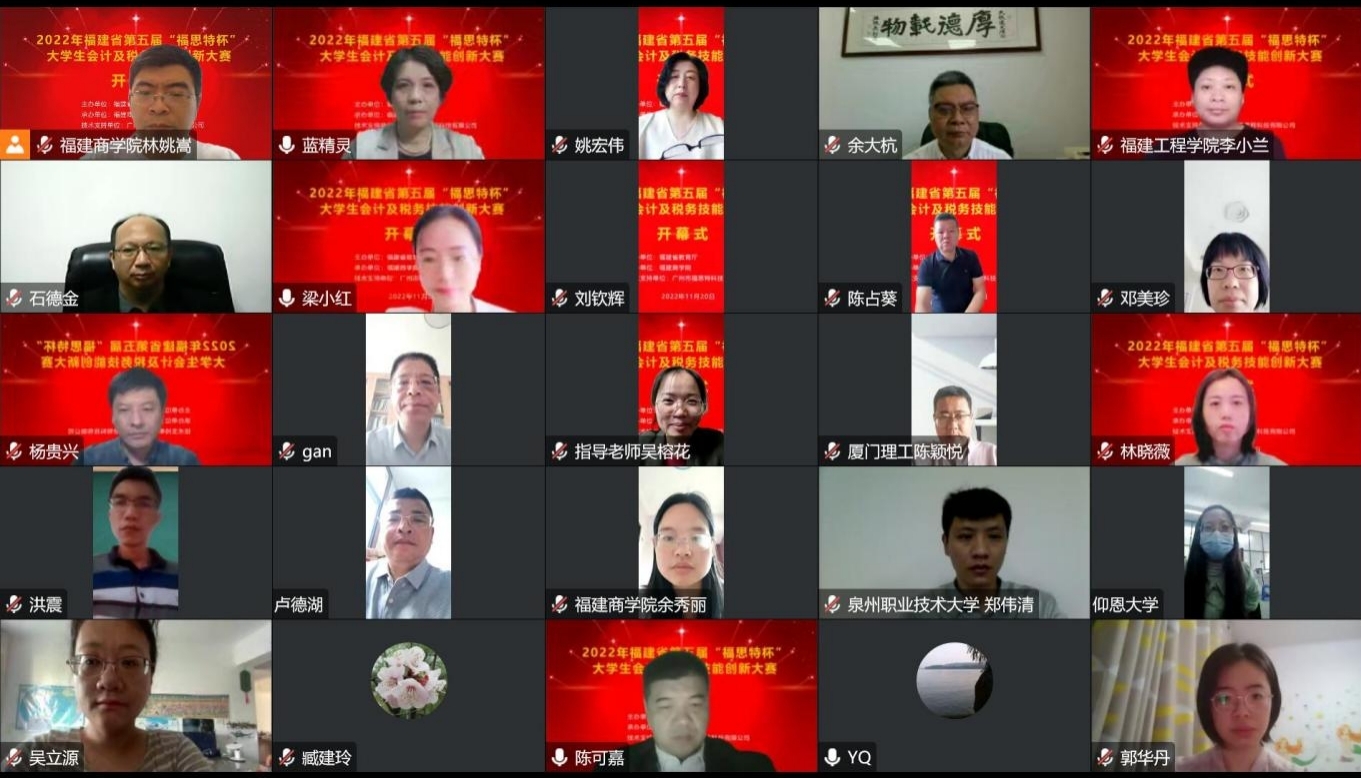 11月20日上午,由福建省教育厅主办,永利官网承办,广州市福思特科技有限公司提供技术支持的福建省第五届“福思特杯”大学生会计及税务技能创新大赛于线上成功举办。大赛组委会成员、技术支持企业负责人以及来自全省30多所高校的经管类学科专业负责人参加了开幕式,校长程灵在开幕式上致辞。全省27所本科高校94支代表队和9所高职院校22支代表队,近400名学生参赛。