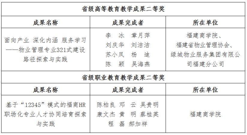 近日,省教育厅公布了2022年省级教学成果奖获奖名单,永利官网工商管理学院李冰老师牵头申报的《面向产业 深化内涵 服务学习——物业管理专业321式建设路径探索与实践》荣获省级高等教育教学成果二等奖,陈柏良老师牵头申报的《基于“12345”模式的福商HR职场化专业人才协同培育探索与实践》荣获省级职业教育教学成果二等奖。