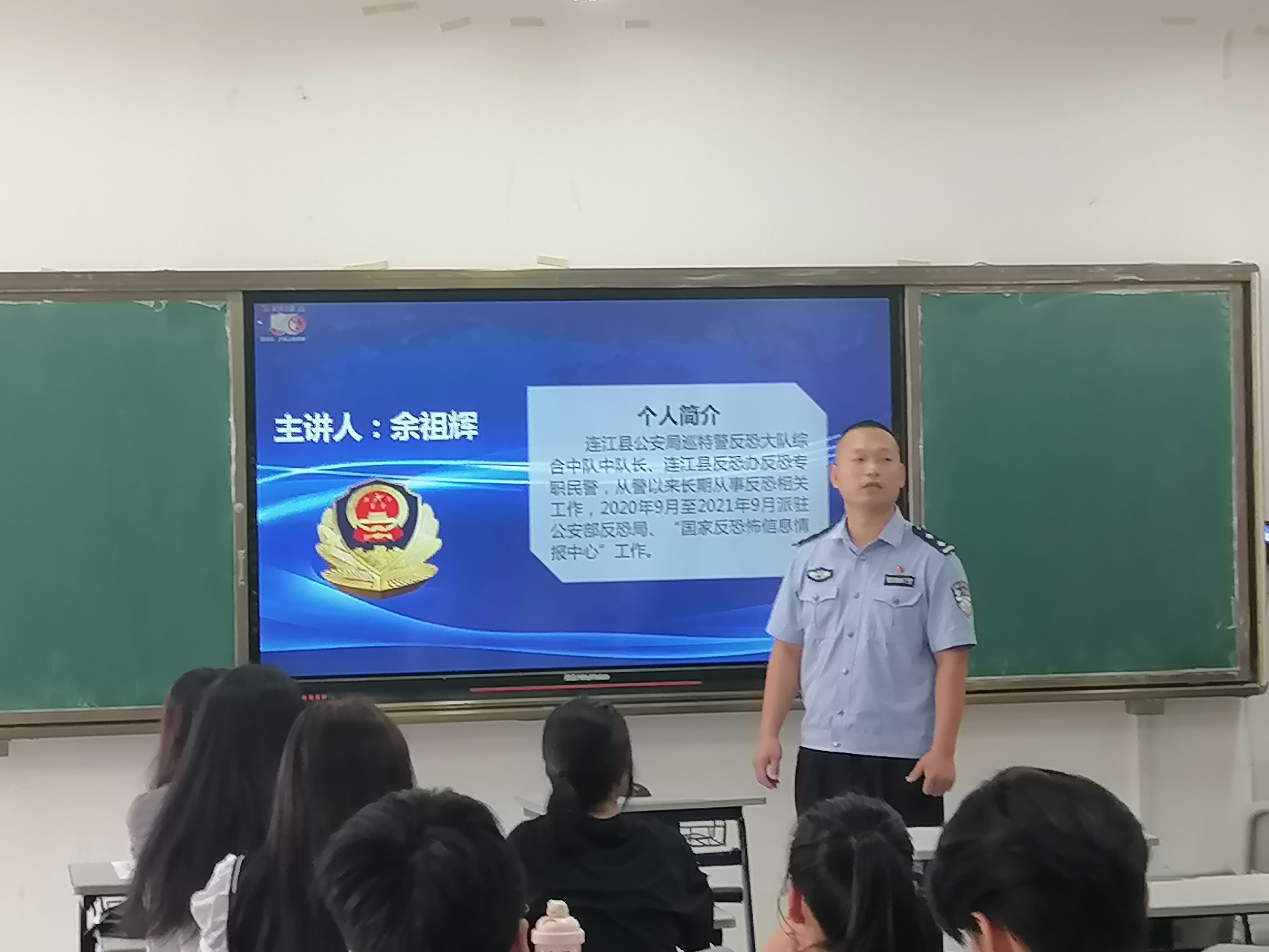 在反恐知识讲座上,余祖辉警官通过讲解什么是恐怖主义、常见恐怖袭击手段有哪些、遇到恐怖袭击如何应对以及反恐法相关内容,结合案例和反恐防恐视频短片,为师生们上了一堂生动的反恐防范知识课。讲座结束后,民警还为学生派发反恐知识宣传材料。