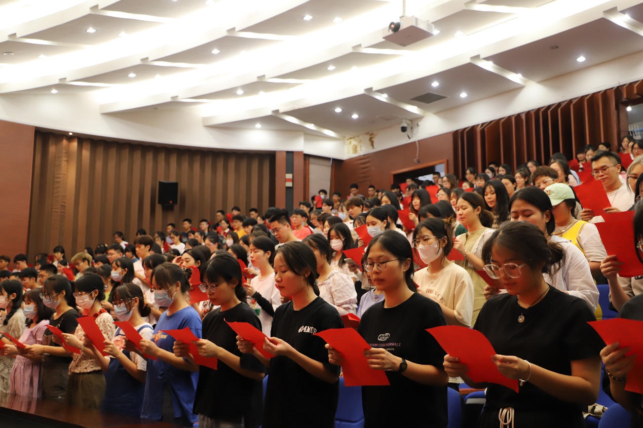 333名2022级新生集体诵读由学院师生共同创作的“福商青年,新征程!新一步!”。新生们许下铮铮誓言,致敬福商荣光:我是福商人,以明德为先、诚信为范、允能为精、笃行为标。我是福商人,为百年新征程聚力启航。福商有我,为时代进一步蓄势待发。“请党放心,强国有我”的青春誓言,展现了新时代福商青年的时代风采。