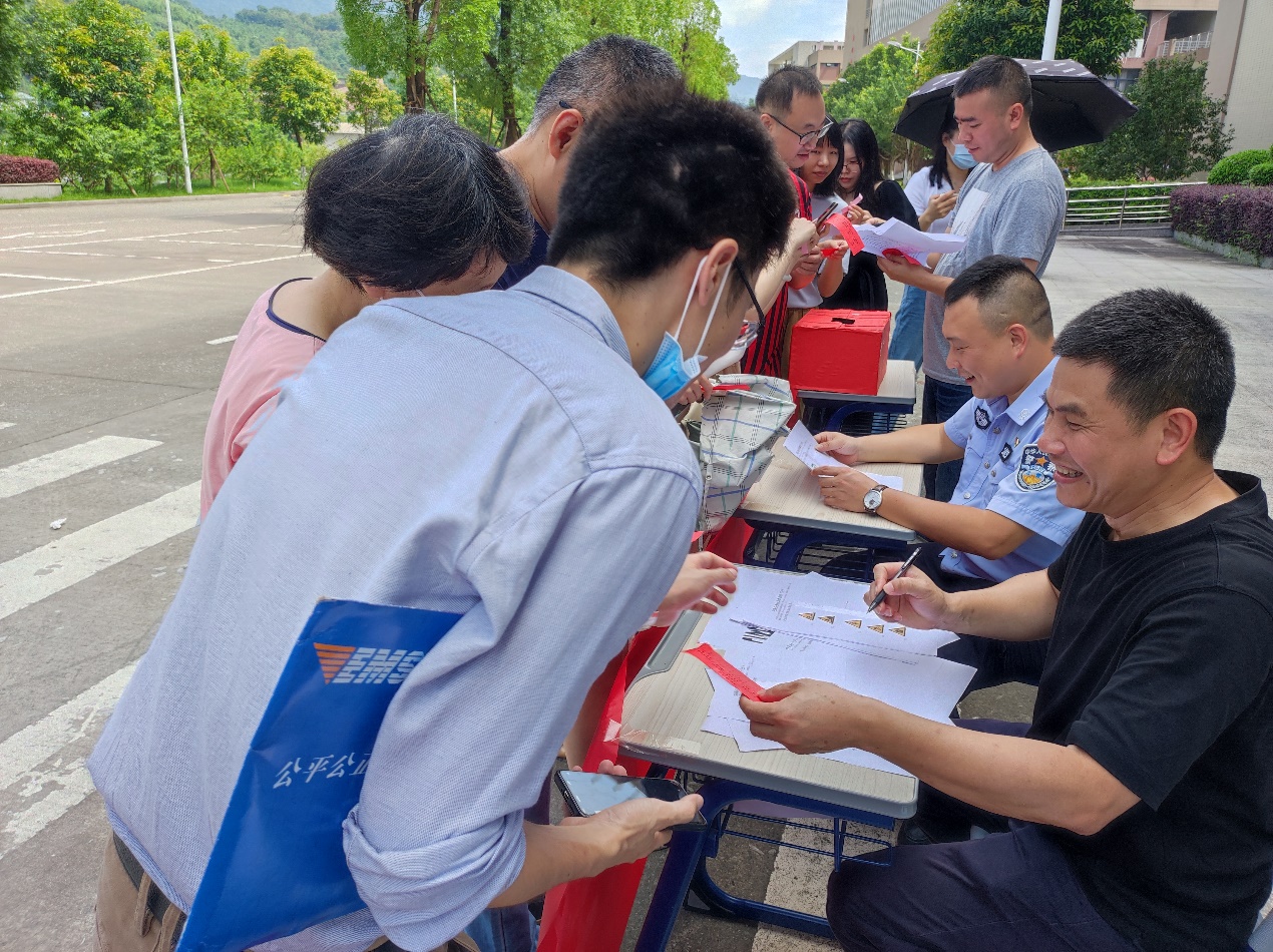 在游戏环节中,“安全猜猜猜”“交通安全标志伴我行”“安全知识我知道”等充满趣味性、知识性的安全游戏吸引了很多师生前来参与,师生们持游戏通关券完成安全猜谜、辨识安全标志、安全知识测试等任务,不仅赢得小奖品,还收获了安全知识。在辨识安全标志游戏项目中,由潘渡派出所林宇警官担任考官。工作人员向在场师生发放安全倡议书,师生们纷纷在主题横幅上签名。