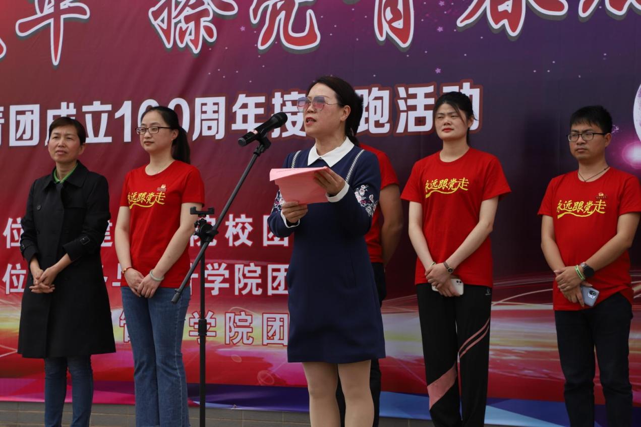 活动现场,校团委老师分别从校领导手中接过熊熊燃起的火炬,带领学院团委负责人奔跑在操场上,100个团支部的优秀青年代表环校园开展火炬接力跑,传递和弘扬“爱国、进步、民主、科学”五四精神,激发青年学生爱党爱国的热情。学生观众还参加了团史知识竞赛、爱国歌曲演唱、听歌识曲等互动活动。在合影环节,青年学生摆出“100”造型,为庆祝中国共青团成立100周年送出诚挚的祝福。
