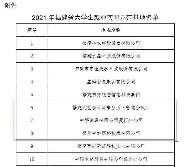 近日,福建省教育厅发布《关于公布2021年福建省大学生就业实习示范基地评选结果的通知》(闽教学〔2022〕5号),确定23家单位为2021年福建省大学生就业实习示范基地,永利官网财务与会计学院推荐的福建天经会计师事务所(普通合伙)、信息工程学院推荐的中移铁通有限公司厦门分公司和福州中旭网络技术有限公司等3家单位成功入选。