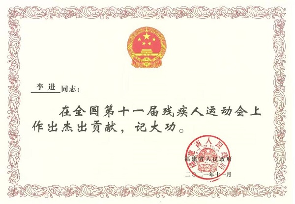 赛后福建省人民政府向福建省盲人足球队全体运动员、教练员发来贺电,号召我省残疾人体育健儿向盲人足球队学习,发扬敢拼会赢的福建精神,勇攀高峰,并对李进老师的杰出贡献记大功!