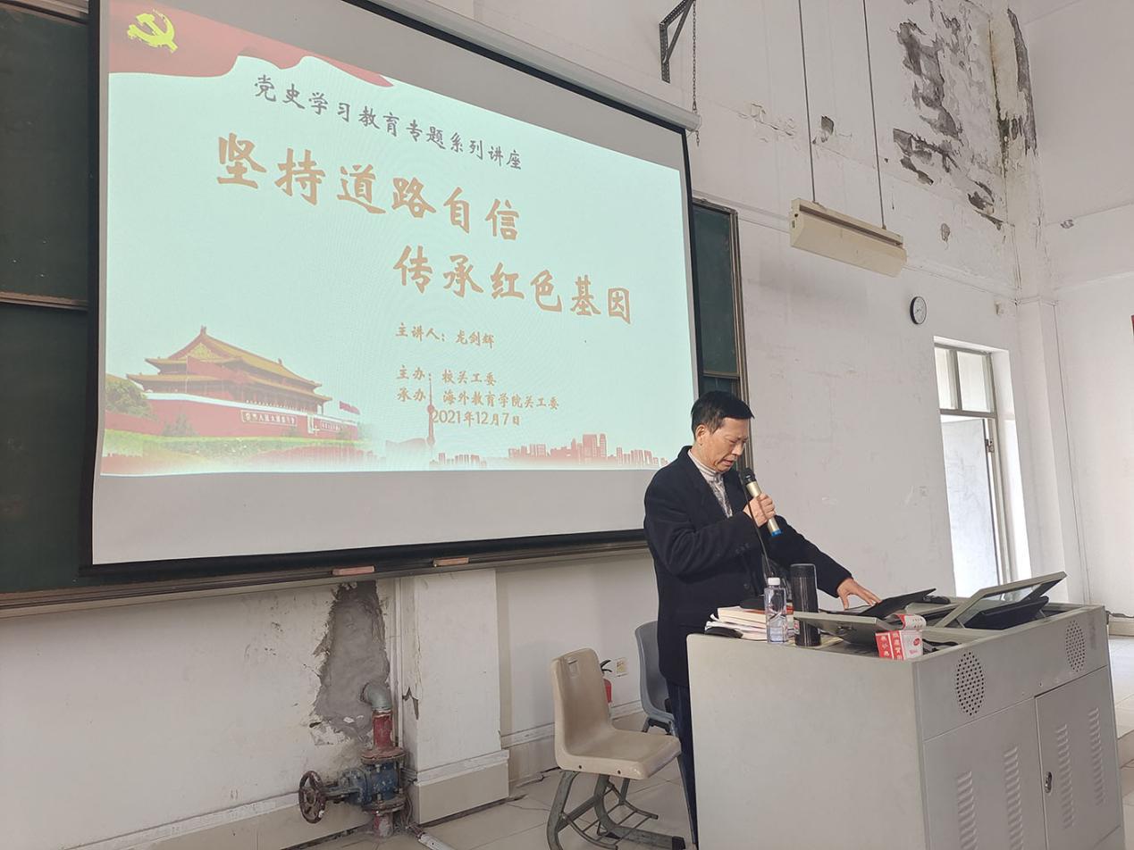 为进一步深入学习百年党史,传承红色精神,增强广大青年学子对中国道路自信的认同感、归属感和自豪感,近日,由校关工委主办、海外教育学院关工委承办的“坚持道路自信,传承红色基因”主题党史学习教育系列讲座在马尾校区非洲厅举行。本次讲座由“光荣在党50年”纪念章获得者龙剑辉同志主讲。校党委副书记、校关工委主任徐晓丹,校关工委、海外教育学院关工委、金融学院关工委有关人员和马尾校区学生党员150余人参加。