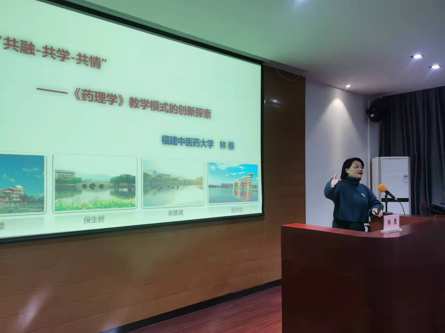 国家教学创新大赛一等奖获得者福建中医药大学林雅教授以《“共融 共学 共情”——< 药理学>教学模式创新探索》为题作了专题讲座。她从教创赛解读、《药理学》教学模式、参赛体会三个方面分享了丰富的教学经验。她指出,教师要在教学上体现课程两性一度,凸显优势特色,融入信息技术手段;要重塑教学内容,重视知识更新融合,打造“共融 共学 共情”教学模式。