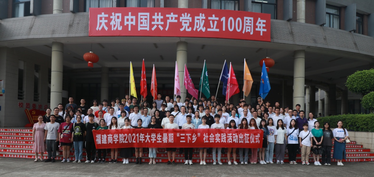 6月29日下午, 永利官网在连江校区举办2021年大学生暑期“三下乡”社会实践活动出征仪式。校党委书记刘剑津、校党委副书记徐晓丹出席了出征仪式,有关处室负责人、各二级学院党委副书记和团委负责人、校团委老师、实践队指导老师及队员代表等参加仪式。
