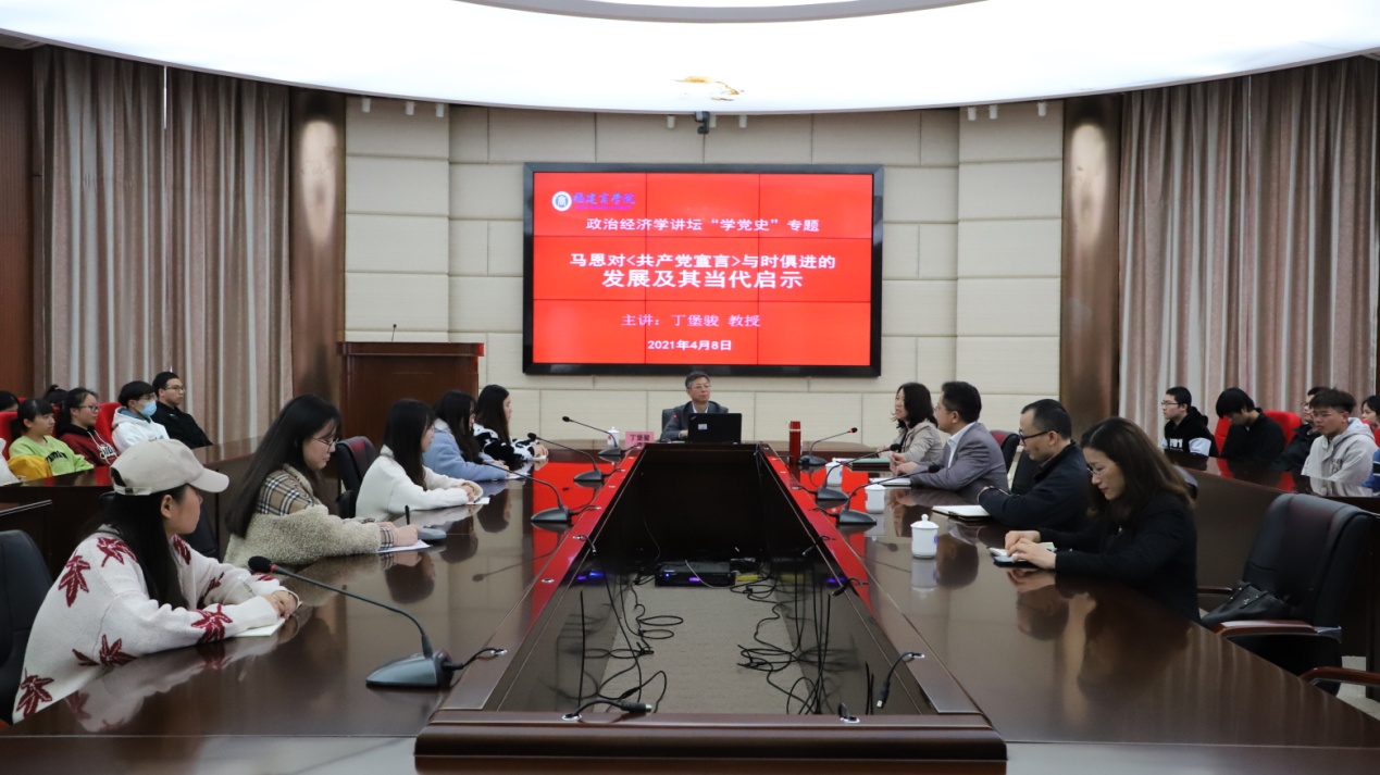 为了认真贯彻落实中央和省委关于开展党史学习教育的通知精神,切实做到学史明理、学史增信、学史崇德、学史力行,4月8日,浙江大学中国特色社会主义研究中心主任、马克思主义学院教授、博士生导师丁堡骏应邀作客永利官网政治经济学讲坛“学党史”专题,为永利官网师生作了题为《马克思恩格斯对< 共产党宣言>与时俱进的发展及其当代启示》的学术报告。校党委副书记徐晓丹主持报告会。