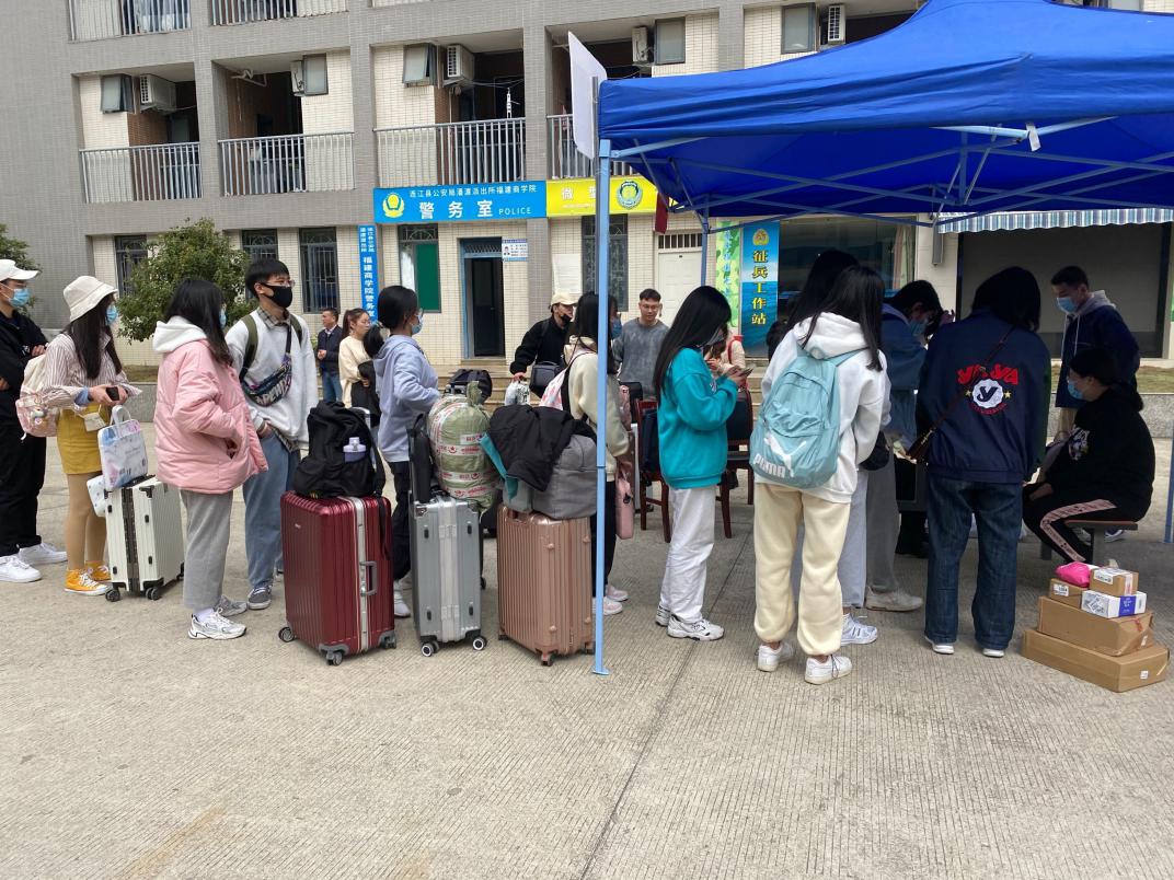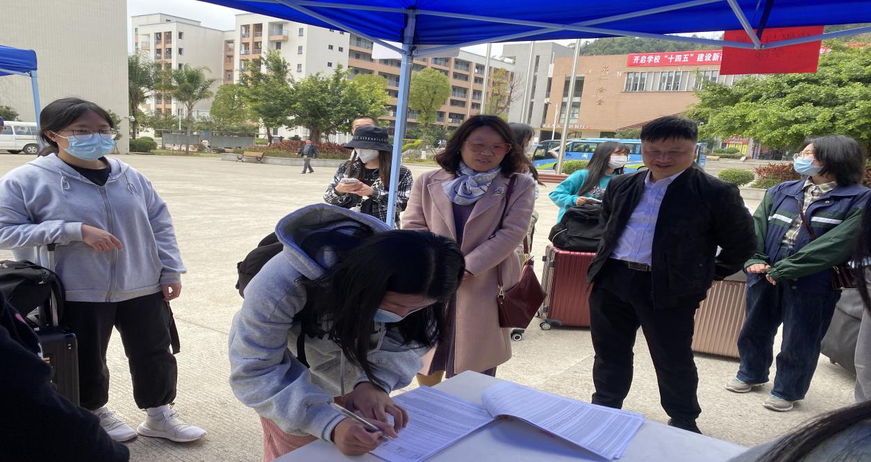 报到当天,学校各单位、各部门分工协作、密切配合,学工部、安保处、后勤处、各二级学院、校医务室等部门工作人员分赴返校工作第一线,及时关注学生返校进展,全程为学生提供服务和帮助。为了尽量减少学生返校途中与社会人群的密切接触,保障学生从家门到校门“最后一公里”的安全,学校协同闽运公司开通了动车站到学校的直达班车,并在校内安排了校门口到宿舍区的接驳车,帮助学生运送行李。