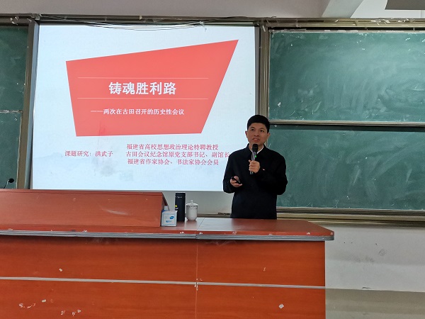 为深入学习贯彻习近平总书记关于学校党建和思政工作的重要指示批示精神,推动学校师生深入学好党史、新中国史、改革开放史、社会主义发展史,12月8日,古田会议纪念馆原副馆长、福建省高校思想政治理论课特聘教授洪武子莅临永利官网开展题为《铸魂胜利路——两次在古田召开的历史性会议》讲座。校党委副书记吴访益和学工部、马克思主义学院部分教师以及校习近平新时代中国特色社会主义思想读书社社员共130多人聆听此次讲座。