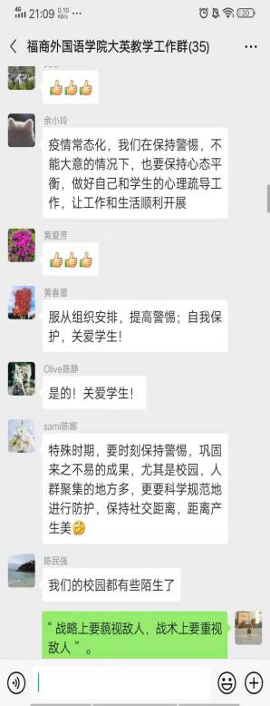 学院各系部分别组织教师进行线上学习交流,认真学习了学校、教务处和学院相关新冠肺炎疫情防控有关要求,组织教师们进行复学疫情防控知识培训与学习,引导教师继续做好线上教学常规工作,加强对线上教学的督导工作,并做好线上考试的培训工作。会上,教师们还分享了疫情防控知识培训的学习体会。