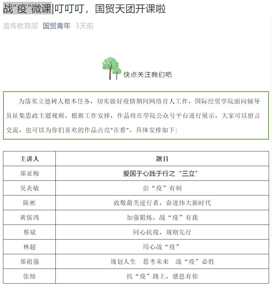 在防控新冠肺炎疫情的关键时期,为宣传全国人民在以习近平同志为核心的党中央坚强领导下齐心协力抗击疫情的重大举措、感人事迹、生动故事,充分挖掘其中蕴含的思想政治教育元素,引导青年大学生增强“四个意识”、坚定“四个自信”、做到“两个维护”,坚定打赢这场疫情防控人民战争、总体战、阻击战的信心和决心,深刻认识中国抗疫彰显的中国共产党领导和中国特色社会主义制度的显著优势,教育引导学生弘扬中国精神,国际经贸学院重磅推出战“疫”系列思政微课,为全院坚守在家的1500余名学子呈上了一份优质的思政大餐。