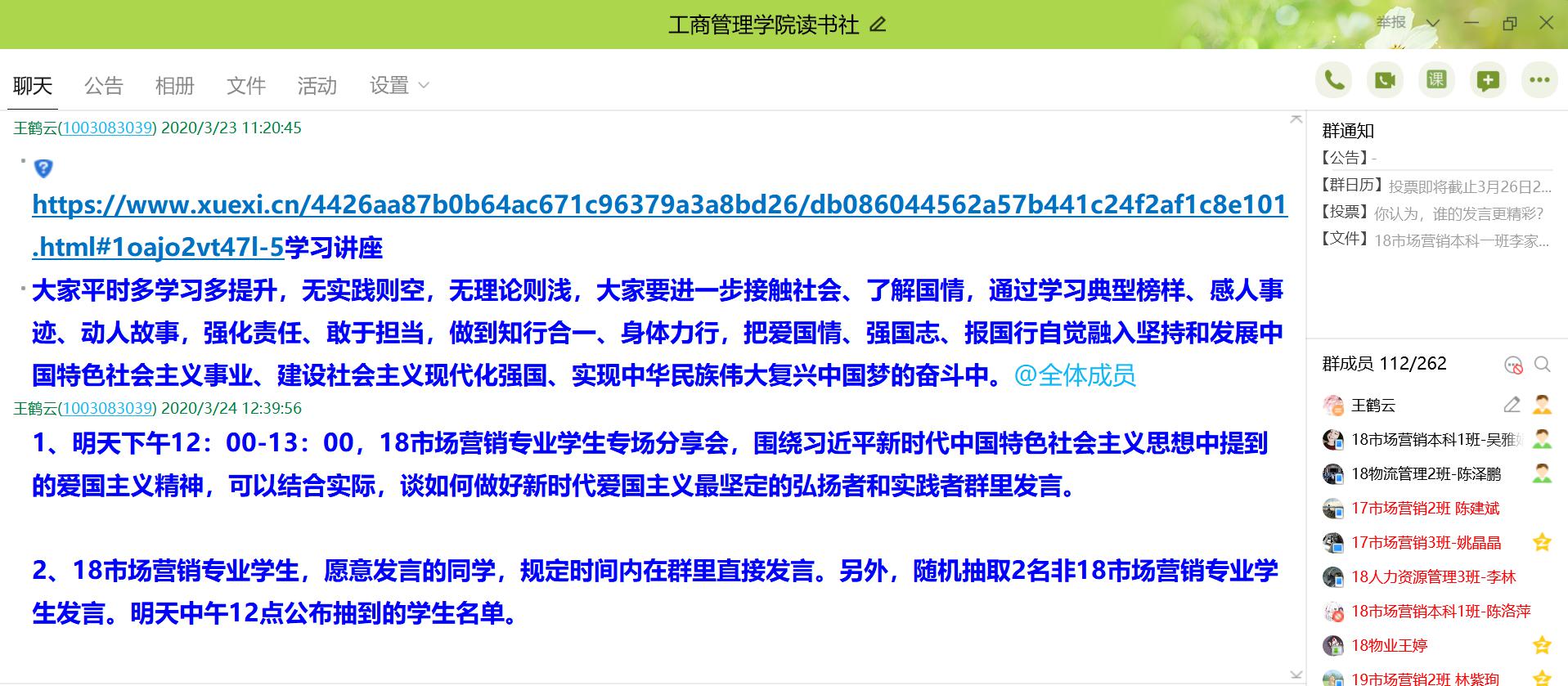 在新冠病毒肺炎疫情期间,工商管理学院习近平新时代中国特色社会主义思想读书社260多名会员按照 “停课不停教,停课不停学”的要求,积极开展网络学习、网络读书分享会等线上学习活动。