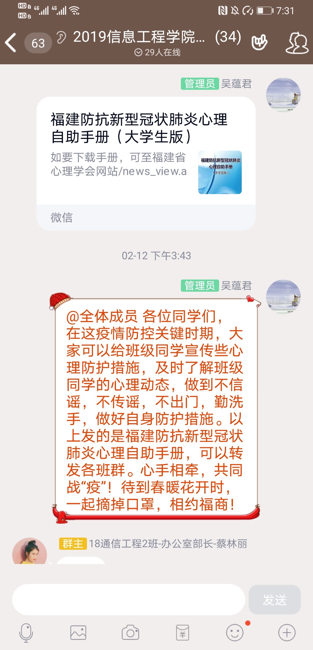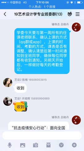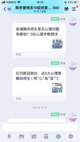 “云关怀”,战胜心理防疫战。随着疫情的扩散,辅导员们深刻意识到开展“心理防疫”工作的重要性,纷纷通过多种途径,推介心理咨询热线及心理支持资源,共同保障学生的心理健康。有的是通过QQ群视频“面对面”,有的是通过电话“线连线”,和学生们聊疫情、聊专升本、聊考研、聊毕业季,合理疏导学生紧张情绪,帮助学生克服恐慌心理,提升学生战胜疫情的信心。财务与会计学院辅导员们通过千里传声电话连线每一位湖北籍学生及其家长,全面了解滞留湖北疫区同学状况,向他们转达了学校领导、老师们的关心与慰问,叮嘱学生要科学防疫、加强身体锻炼、加强学习,坚定同心战“疫”的信心。