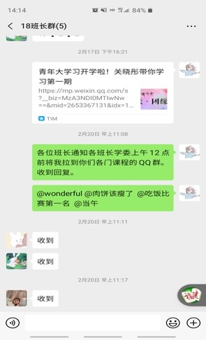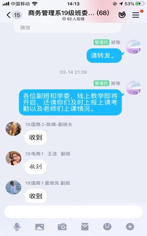 “云听课”,助力线上教学堂。2月17日是学校教师线上开课的第一天。细心的同学们会发现云课堂上经常出现一些“不速之客”。其实,自“开学”起,辅导员每天都悄悄“走” 进学生加入的腾讯课堂、学习通、QQ群等授课平台,与学生共同听课,及时了解平台运行情况、学生出勤情况、维持正常教学秩序,配合教师解决问题,让“停课不停学”得到有力保障。
