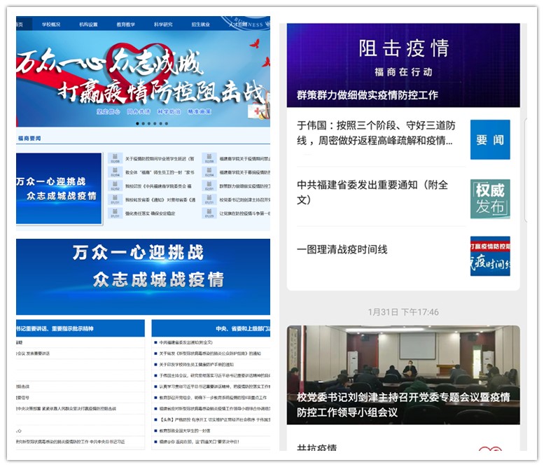 当前,新型冠状病毒感染的肺炎疫情还在蔓延,形势依然严峻,校党委、校疫情防控工作领导小组认真贯彻落实习近平总书记关于防控新型冠状病毒感染的肺炎疫情的重要讲话、重要指示批示精神,落实党中央、国务院、福建省委和省委教育工委的决策部署,落实全省教育系统应对新型冠状病毒感染的肺炎疫情防控工作视频会议精神,继续把疫情防控工作作为学校当前最重要的工作任务来抓,在疫情防控工作中指挥到位、部署到位、管理到位、宣传教育到位、教学指导到位、监督检查到位、示范引领到位,切实将各项防控工作抓实抓细,力保防控“无死角”,坚决打赢疫情防控阻击战。