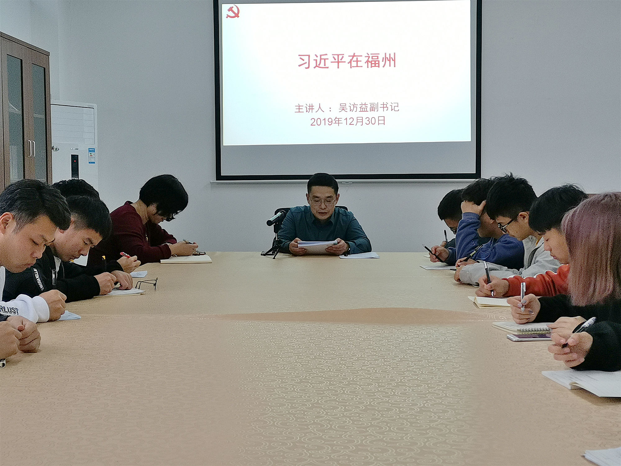 12月30日下午,校党委副书记吴访益在马克思主义学院会议室,给校习近平新时代中国特色社会主义思想读书社学生讲授了一堂思政课。马克思主义学院部分老师和读书社成员参加学习。