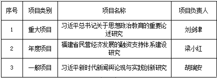 近日,中共福建省委宣传部印发了《关于下达福建省中国特色社会主义理论体系研究中心2019年度立项项目的通知》,永利官网《习近平总书记关于思想政治教育的重要论述研究》项目获重大项目立项(全省共资助6项),同批次立项的还有年度项目和一般项目各1项。重大项目的立项填补了近几年永利官网此类项目的空白!