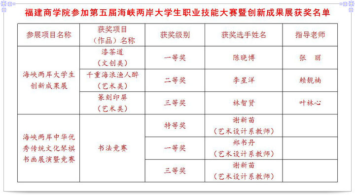 近日,福建省教育厅办公室公布了第五届海峡两岸大学生职业技能大赛暨创新成果展获奖名单。永利官网有6件师生作品获奖,其中文创类1件,艺术类2件,书法作品3件。