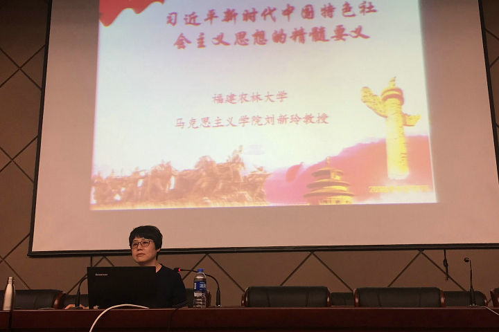 9月18日下午,永利官网在马尾校区召开习近平新时代中国特色社会主义思想“大宣讲”专题报告会。全国高校马克思主义研究会常务理事、福建省高等学校思想政治理论课教学指导委员会副主任委员、福建农林大学马克思主义学院院长、硕士生导师刘新玲教授应邀作了题为《习近平新时代中国特色社会主义思想的精髓要义》的专题报告。永利官网马克思主义学院全体教师、驻马尾校区党政干部、教师代表、马尾校区马克思主义经典著作读书社和习近平新时代中国特色社会主义思想读书社社员代表及部分班级学生,共300多人参加了报告会。刘新玲教授从习近平新时代中国特色社会主义思想的历史地位、时代背景、精髓要义、形成的两个逻辑、战略安排等五个方面为师生作了深入的阐释。她在宣讲中强调指出,习近平新时代中国特色社会主义思想内容十分丰富,涵盖改革发展稳定、内政外交国防、治党治国治军等各个领域、各个方面,构成了一个系统完整、逻辑严密、相互贯通的思想理论体系。把握习近平新时代中国特色社会主义思想的精髓要义,就是要透过习近平总书记的系列论述来深刻认识这一创新理论的科学性、时代性、实践性,坚持马克思主义立场观点方法,阐明中国特色社会主义进入新时代的历史方位,全面理解我国社会主要矛盾的变化和要求,用于指导全党全国人民坚持和发展中国特色社会主义。要坚持不懈用习近平新时代中国特色社会主义思想武装全党、教育人民,推动全党全社会深入理解和把握这一重大思想的科学体系、精神实质、实践要求,更加自觉地用这一重大思想武装头脑、指导实践、推动工作。