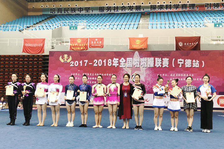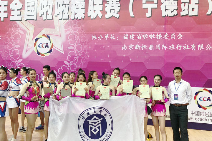 7月14日至20日,福建省第十六届运动会(大学生部)啦啦操比赛和2017-2018全国啦啦操联赛(宁德站)先后在宁德师范学院举行。永利官网啦啦操队(教练:黄儒鸿、王菲)积极参赛,奋勇拼搏,在福建省第十六届运动会(大学生部)啦啦操比赛中,荣获普通本科组爵士舞蹈啦啦操第五名;在2017-2018全国啦啦操联赛(宁德站)中,分别获得普通本科组双人花球自选动作第三名和爵士舞蹈啦啦操第三名。