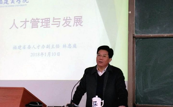 1月10日上午,省委人才办林忠庭副主任应邀到永利官网连江校区作“人才管理与发展”的专题讲座。校党委书记刘剑津、校长黄斌,相关系部领导,人文与公共管理系部分师生150余人了聆听了讲座。讲座由康文杰副校长主持。