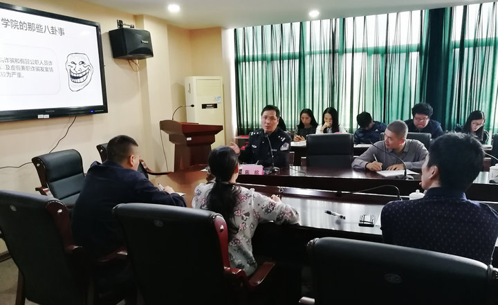 会上,陈榕副所长对马尾校区近期发生的网络诈骗情况作了通报,并作了“防网络诈骗”专题报告。他结合近期福州大学城所发生的众多网络电信诈骗实例,从电信诈骗产业链的构成、特点、典型案例及做好防范工作等方面进行了深入讲解。随后,派出所民警潘如针对当前校园网络诈骗存在的具体问题提出防范措施。