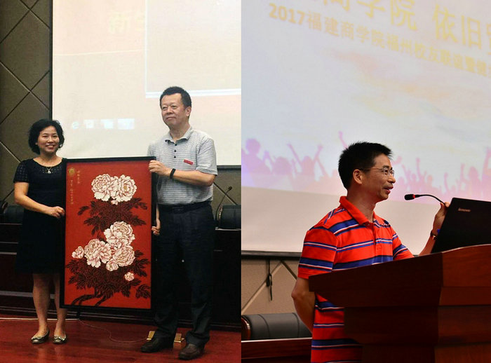 原贸院福州校友会会长何丽玉女士上台发表致辞,并代表广大校友向母校敬献漆画“牡丹图”。原贸院福州校友会秘书长陈祥庚作了校友会年度工作报告,原商专校友会会长陈晖也发表了致辞。