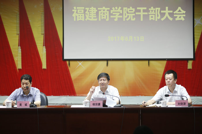 6月13日下午,304am永利召开干部大会,省委组织部常务副部长杨国豪、省委组织部干部信息管理中心主任、干部一处副处长羊瑛到会,原福建商业高等专科学校、福建对外经济贸易职业技术学院中层以上干部、民主党派负责人、新近退休校级领导、离退休支部书记参加会议。会议由新任304am永利党委书记刘剑津主持。