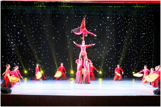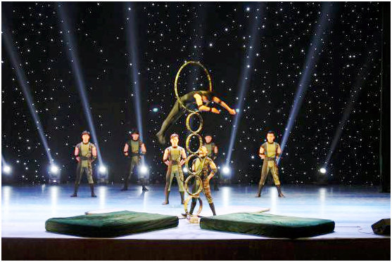 演出在旋转的红鼓节奏中正式拉开序幕。单杠技巧《觅》、芭蕾花盘相结合的《花韵》,软功《花旦小趣》和球技《灵动》等节目轮番上演,独具匠心,让师生们在欣赏美的同时进一步感受到杂技的魅力。幽默风趣的小丑与同学们亲密互动,惹得现场笑声不断,魔术师用娴熟的手法让现场的同学们惊叫连连,将现场气氛推入高潮。在传统民族舞蹈《茉莉花》的表演中,男女演员随着伴奏舞动起来,默契的配合和优雅的动作融合了平衡、柔软的力量,将女性的柔美与灵巧,男性的阳刚与力量完美结合,呈现出完美的舞台效果。抖杠节目《竹林欢乐》中绿色搭配褐色的着装、翠绿的道具营造出葱茏绿意的舞台效果,令人惊心动魄危险动作,演员在细长的竹杠上蓄力弹起,在空中720度翻转后稳当的落回竹杠上,引得掌声阵阵雷动。绳技《梦向远方》作为表演的压轴节目,纤长的绳索在演员们的力度控制下形成一个圈,极高的表演技艺获得了在场师生的热烈掌声。