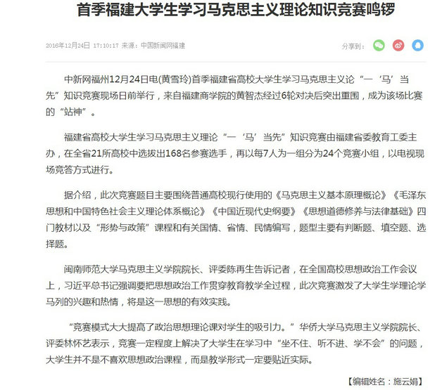 日前,由福建省委教育工委主办的福建省高校大学生学习马克思主义论“一‘马’当先”知识竞赛首季比赛在福建教育电视台成功举办。永利官网学生黄智杰经过6轮对决后突出重围,成为该场比赛的“站神”,直接进入到半决赛。中国新闻网以《首季福建大学生学习马克思主义理论知识竞赛鸣锣》为题报道了该场比赛。新闻链接:http://www.fj.chinanews.com/news/2016/2016-12-24/370026.shtml?open_source=weibo_searc