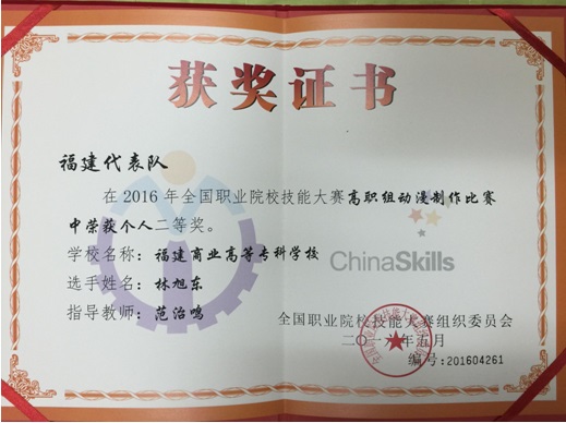 永利官网高度重视学生职业技能大赛,赛前多次专门组织专业教师对学生进行系统培训。永利官网商业美术系林旭东同学以2016年福建省职业院校技能大赛“动漫制作”赛项第一名的成绩作为福建代表队选手参加2016年全国职业院校技能大赛,在指导教师范治鸣的精心指导下,该生专业技能不断增强,比赛中沉稳应对,充分发挥了自身扎实的专业知识和较强的动手能力,取得了佳绩。