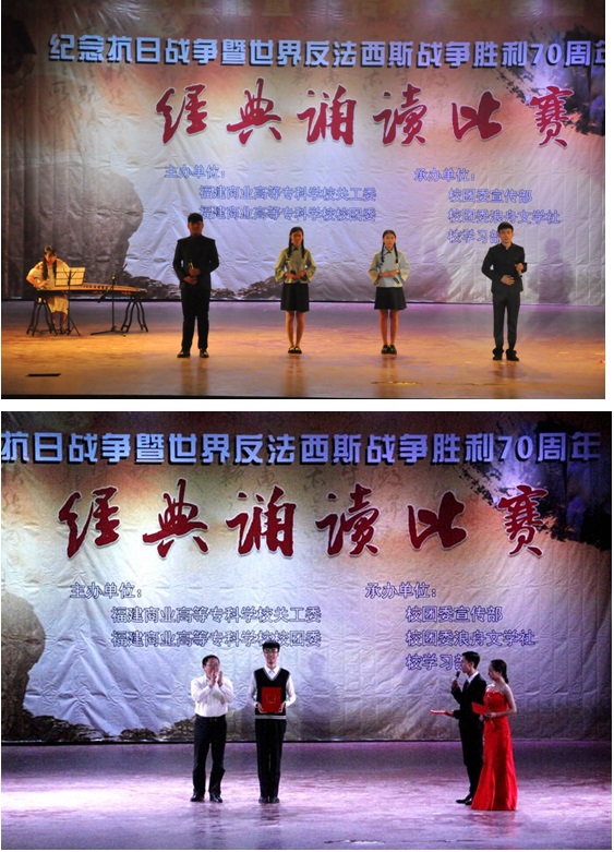为纪念抗日战争暨世界反法西斯战争胜利70周年,由校团委、校关工委主办的经典诵读比赛,于11月10日在校活动中心举行。出席本次比赛的嘉宾有校党委副书记黄跃舟,副校长、关工委主任胡新平,原副校长、关工委常务副主任柯芸笙等。退休老教师陈鼎栋、廖建国和关工委委员林羽、林忠和老师应邀担任评委。