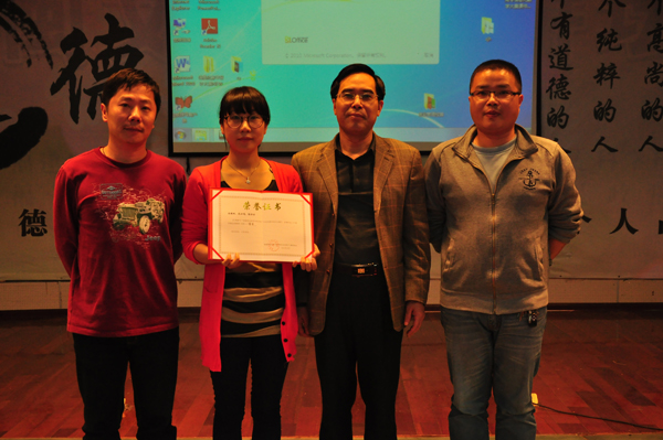 副校长吴贵明、副书记黄跃舟为获得二等奖的教师颁奖并合影