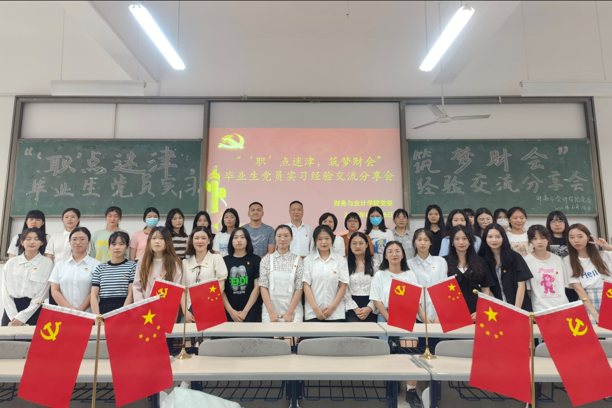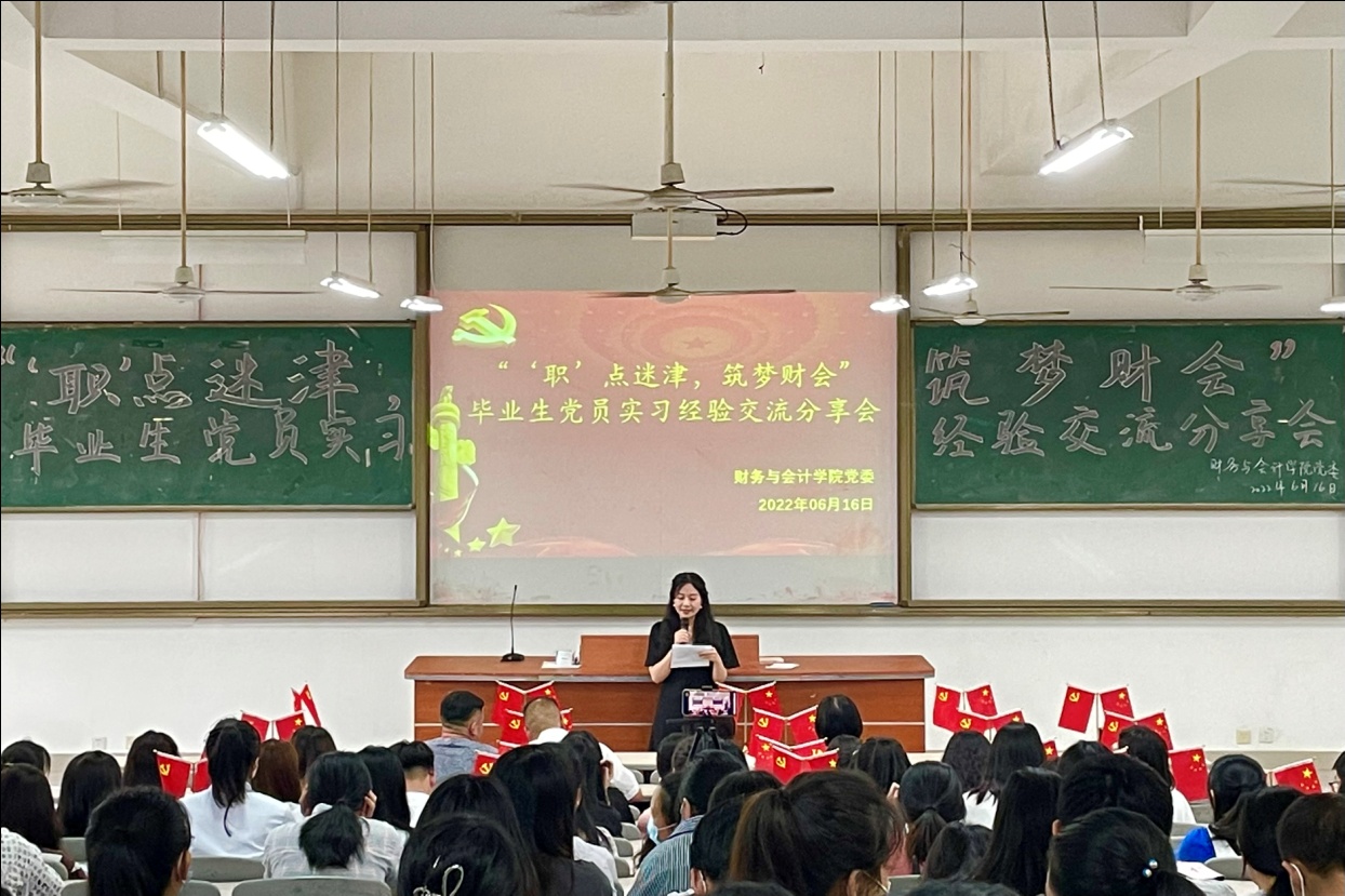 为推动党史学习教育深入人心,继续贯彻落实“我为群众办实事”实践活动要求,6月16日下午,财务与会计学院党委在诚信楼大阶二举行“‘职’点迷津,筑梦财会”毕业生党员实习经验交流分享会。财务与会计学院党委有关负责人和各党支部书记、党员参加了本次分享会。