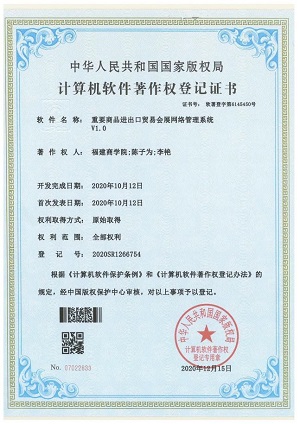 近日,经中国版权保护中心审核,传媒与会展学院20会展经济与管理专业陈子为同学和18会展经济与管理李艳同学联合申报的《重要商品进出口贸易会展网络管理系统》,顺利通过了中华人民共和国国家版权局中国版权保护中心的审核,喜获计算机软件著作权登记。(登记号为2020SR1266754)