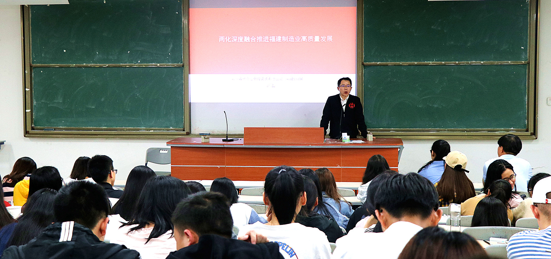 谢磊总经理以“两化深度融合推进福建制造业高质量发展”为主题,向同学们介绍两化融合的基本知识和内涵,并结合自己在行业里积累的经验和丰富的阅历,对于策划“两化”融合产业会议提出具体的建议。