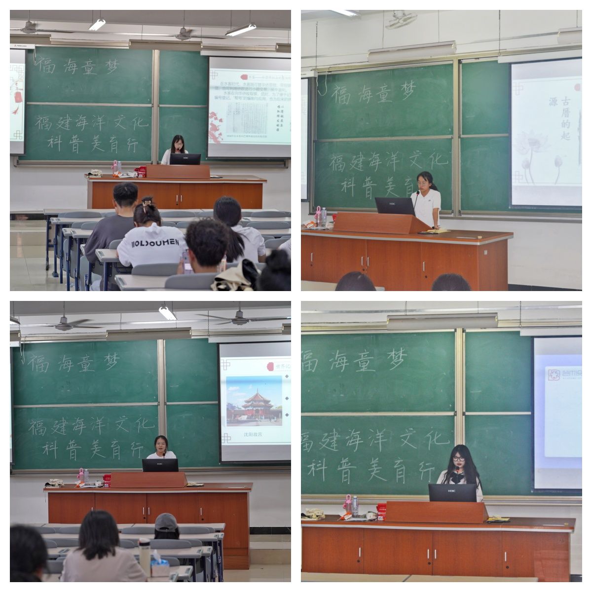 科普协会的陈红羽、廖烨敏、黄燕滨、苏钰四位同学围绕闽商人物、闽商风物、闽商历史、闽商精神等,以“海洋文化科普与美育”“侨批文化资源开发”“世界记忆遗产知识”“侨商文化与古厝的联系”为主题进行演讲,运用自己的专业知识,结合暑期社会实践和创新创业训练项目的实践体验,生动有趣地讲述了闽商创业故事、福船制造技术和汇兑技术方面的创新之举等。同学们熟练的讲解技巧、从容自信的表达,使师生产生浓厚的兴趣和情感共鸣,赢得阵阵掌声。