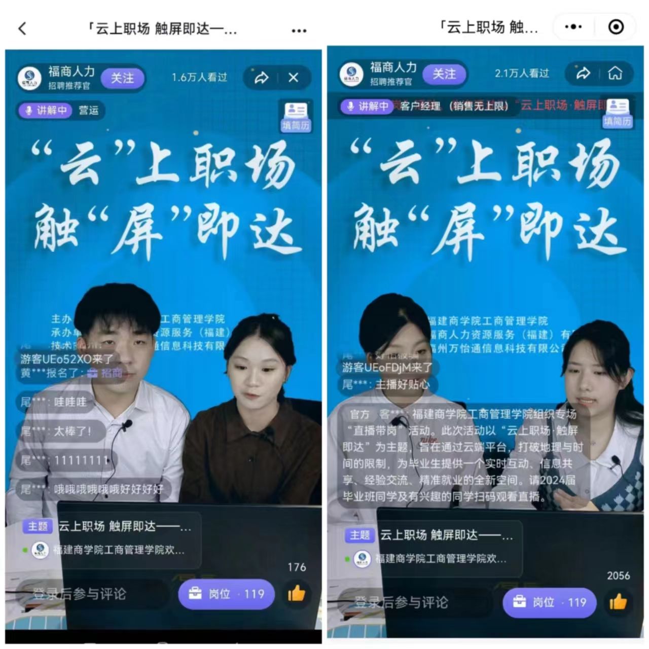 近日,工商管理学院联合福商人力资源服务(福建)有限公司、福州万怡通信息科技有限公司、福商HR联盟等,共同开展“云上职场,触屏即达”线上直播带岗促就业活动。