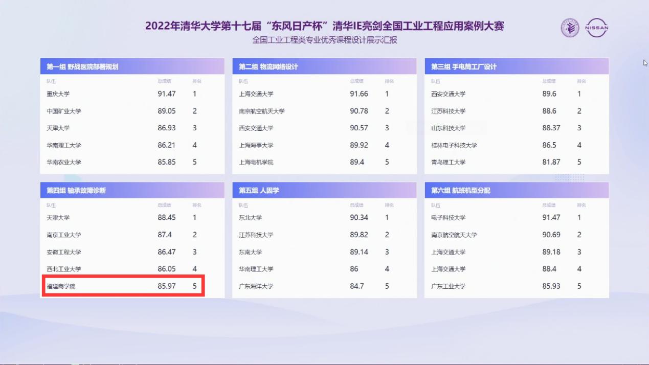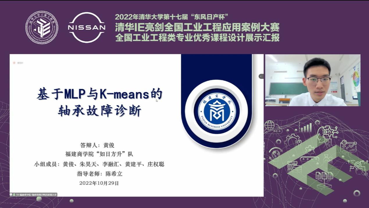 10月29日,在“第十七届‘东风日产杯’清华IE亮剑全国工业工程应用案例大赛”中,永利官网传媒与会展学院管理工程系工业工程专业参赛代表队(黄俊、朱昊天、李融汇、黄建平、庄权聪,指导老师陈希立)凭借参赛项目——“基于MLP与K-means的轴承故障诊断”,以决赛第五成绩荣获二等奖,实现了永利官网在该项赛事上的重大突破。