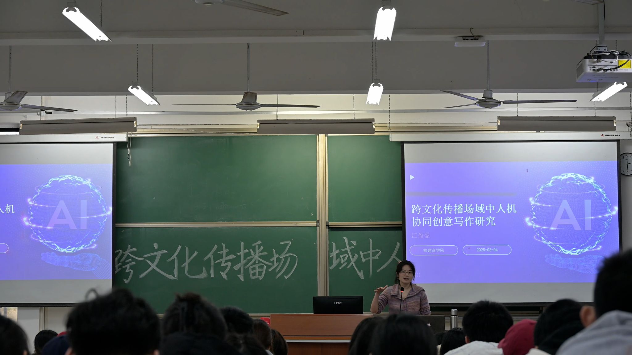 外国语学院江盈盈老师作为讲座嘉宾,从跨文化传播的机遇和数智跨文化创意写作新模态两方面进行讲解,围绕从“文明冲突”到“文明互鉴”的范式转变,重点分析了以DeepSeek为例的跨文化创意写作实践案例,并现场指导了AI生成短视频脚本的技巧与方法,激发同学们浓厚兴趣。
