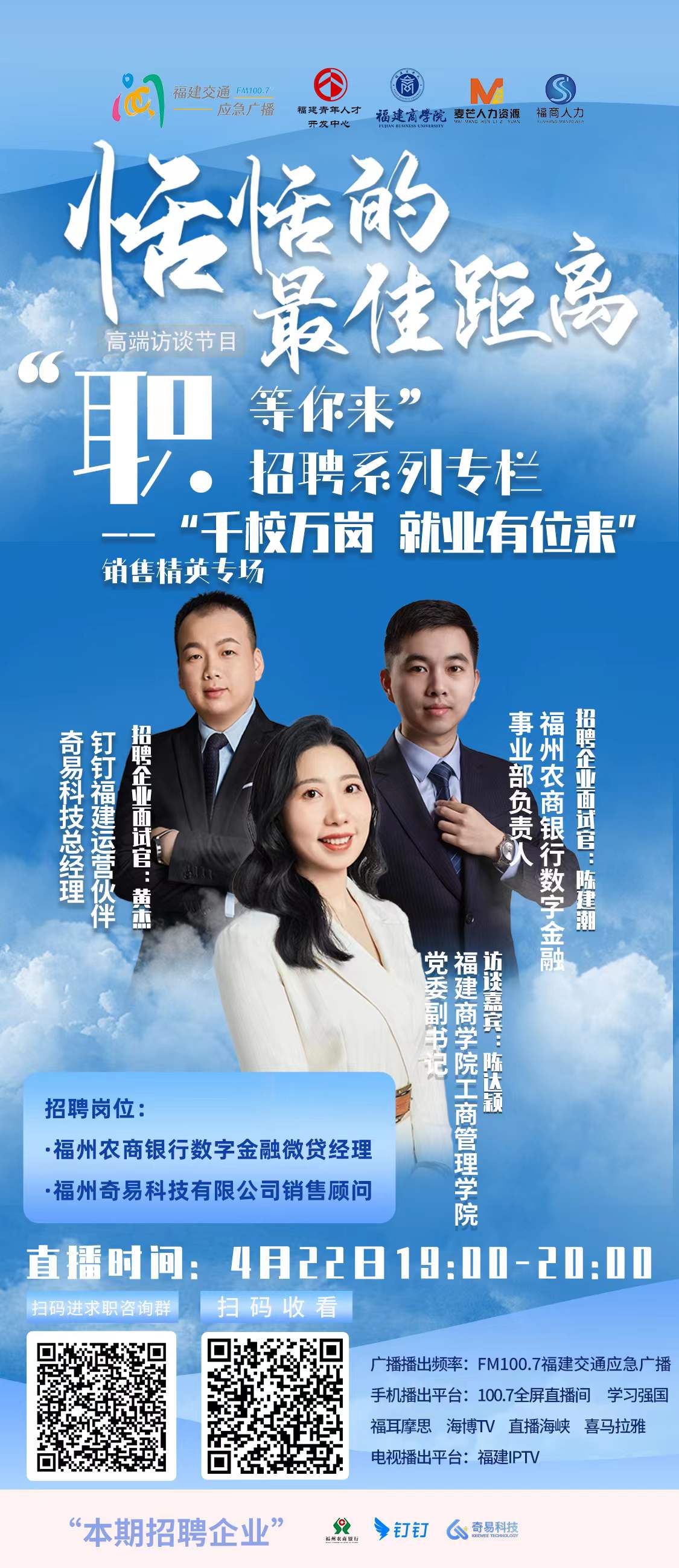 本次直播平台为FM100.7福建交通应急广播。在直播中,工商管理学院负责人解读了有关就业创业政策,福州农商银行和钉钉福建中心负责人介绍了企业概况、招聘岗位、招聘条件和薪酬待遇等信息。本次直播,共在三个平台播出。其中,FM100.7全屏直播间收获观看量达259.17万人次,福建IPTV收获观看量达168.9万人次,100.7视频号收获观看量达3410人次,全网累积观看达400余万人次。现场连线招聘过程中,招聘企业面试官耐心解答求职者的问题,直播期间在线投递简历、互动问答不断。截止目前,永利官网已有8位毕业生与福州农商银行、钉钉福建中心达成初步就业意向。